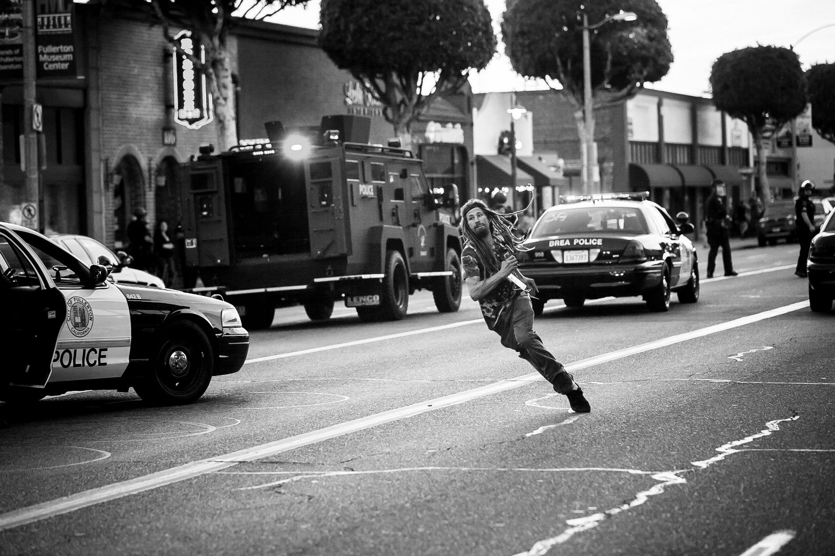 “My friend Anaheim James, is one of the most peaceful protesters I know, he was in fact wearing a ‘no violence’ sign on his back when a little over a year ago a police car, filled with soft, slow, angry officers, tried to run him down at a protest we held after the verdict in the Kelly Thomas case came in. Thankfully AJ is swift of foot, he leaped over the hood of the cop car, and as these photos show, dispersed the scene like the fucking wind. Despite all evidence showing James out dispersing overpaid, and overfed fullerton officers, he was arrested 3 months later and charged with … Get this… “FAILURE TO DISPERSE A RIOT”. AJ along with Patti Beers, Juan Zuleta and Adam Adler, all friends of mine, and all equally unjustly charged, will go on trial at north court on March 11th and they are all facing six months in jail if found guilty. According to the 170 page police report, 47 uniformed officers, and multiple plain clothes officers were there to keep the peace on the day of the protest. I was there as well, and there was No fucking Riot. If there had been a riot, you know like every ordinary 2am on a Friday night, it would be the incompetence of this department which should be on trial as they outnumbered us 3-1 by the end of the day.