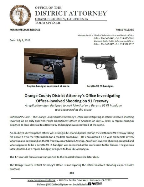 Media reports from the OC Register and LA Times referred to eyewitnesses who gave conflicting accounts of the teenager either raising what appeared to be a gun while exiting her vehicle or holding a cell phone.  Four days after the shooting the OC District Attorney’s office released a statement focusing primarily on a replica gun reportedly found at the scene. The press release went so far as to show side by side an image of the realistic looking gun next to an image of a Baretta handgun to emphasize the similarity between the two, but declined to specify where exactly the replica gun was found.