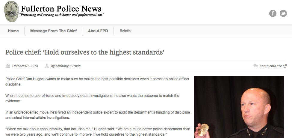 It is highly disturbing to read that any FPD officer considers bashing in the face of a person and issuing profanity laced threats to be acceptable behavior, but the fact that this opinion comes from a training officer may provide some insight into the department’s current and past standards. Chief Dan Hughes has stated in recent months that the Fullerton Police Department holds itself to “the highest standards,” but it is hard to reconcile this promise with the testimony of Cpl. Rubio.